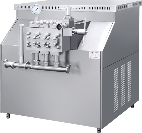 生產型均質機主要工作是通過柱塞往復運動將被加工物料以高壓的形式送至均質閥,使物料流經閥頭與閥座間微小的隙瞬受到湍流、空穴、撞擊、剪切等復合的作用,將原先粗糙的乳濁液或懸浮液加工成極細微的、均勻穩定的液與液相混乳化物或液與固分散物。
